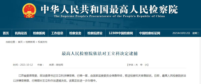 移投界讯:据最高检官网10月12日消息,江苏省委原常委、政法委原书记王立科涉嫌受贿、行贿一案,由国家监察委员会调查终结,移送检察机关审查起诉。日前,最高人民检察院依法以涉嫌受贿罪、行贿罪对王立科作出逮捕决定。该案正在进一步办理中。