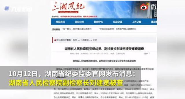 移投界讯:10月12日9时35分,湖南省纪委监委官网三湘风纪网发布消息称,湖南省人民检察院党组成员、副检察长刘建宽涉嫌严重违纪违法,目前正接受湖南省纪委监委纪律审查和监察调查。