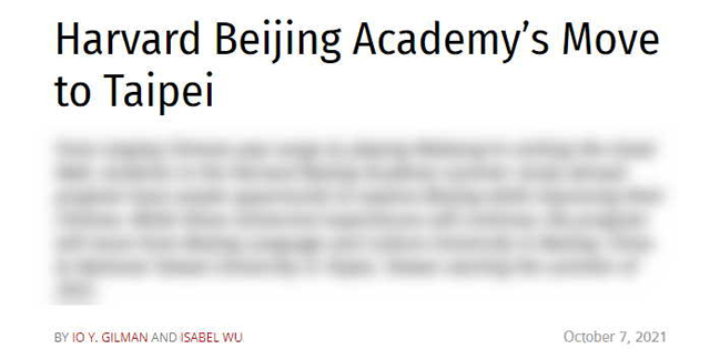 移投界讯:美国哈佛大学学生刊物《克里姆森报》10月7日消息,原先设置在北京语言大学里的“哈佛北京书院”将从2022年开始改为与台湾大学合作并迁往台北,并且改名“哈佛台北书院”。